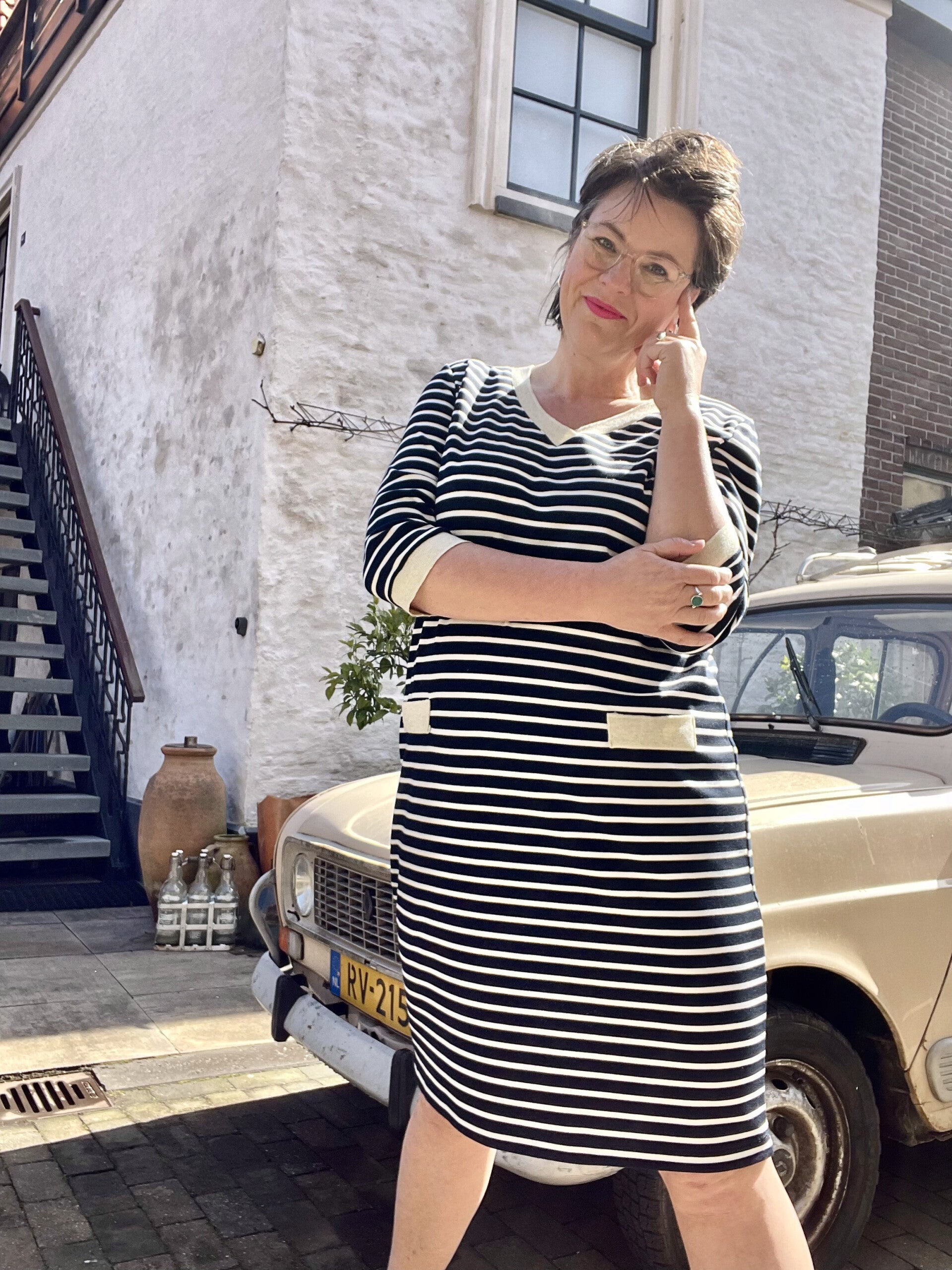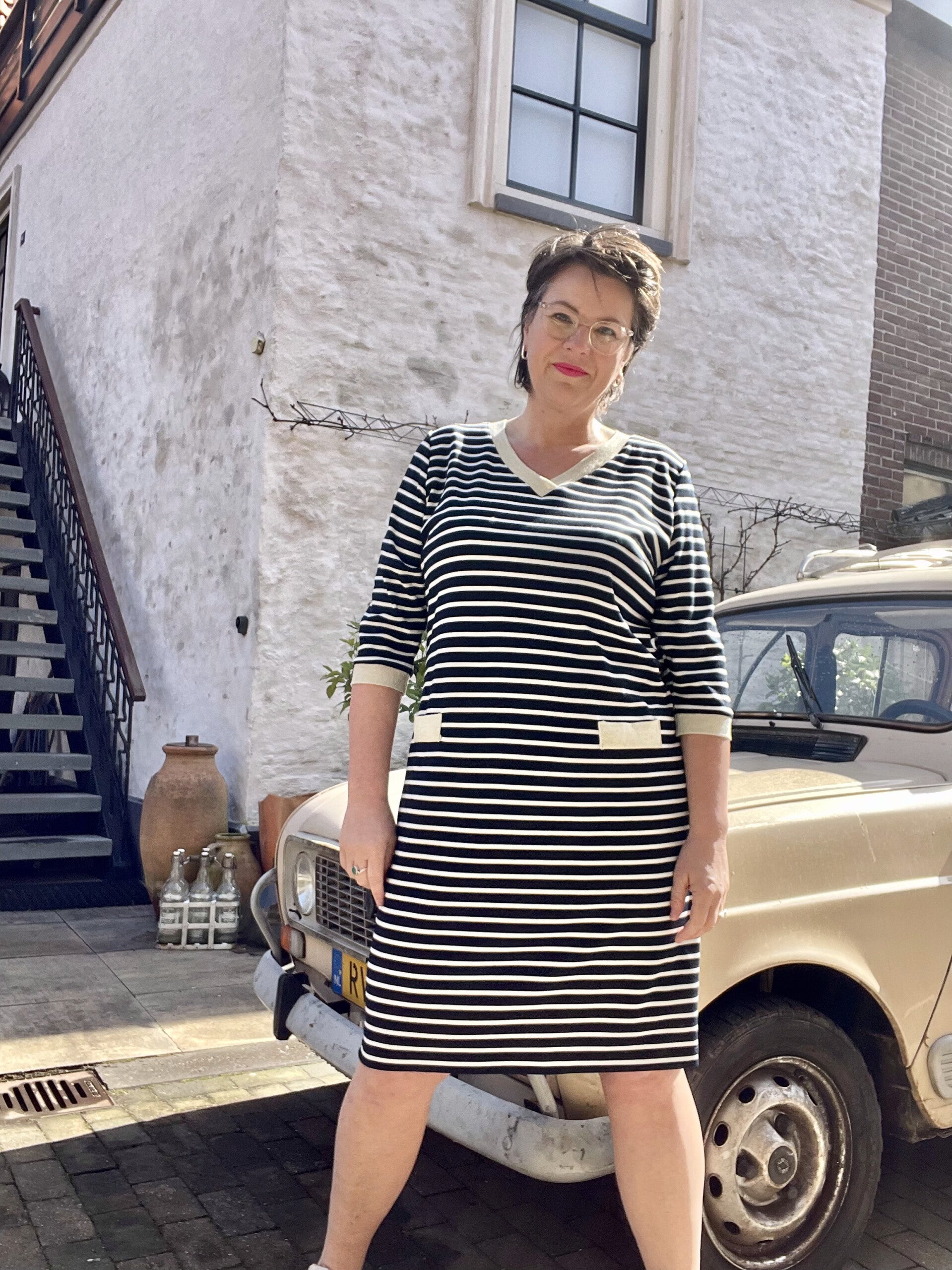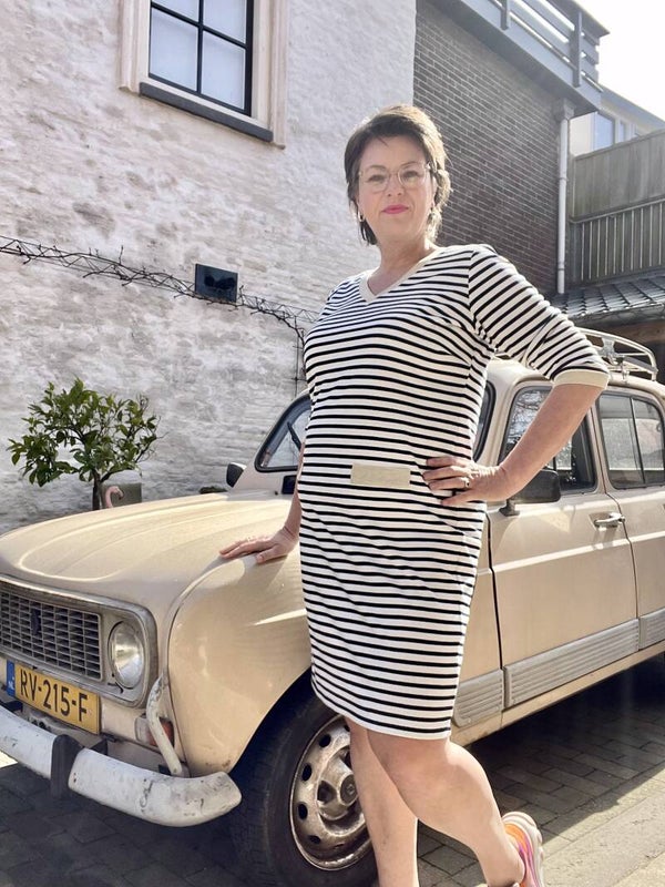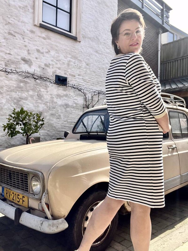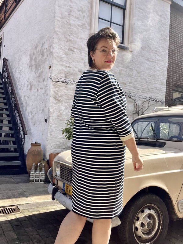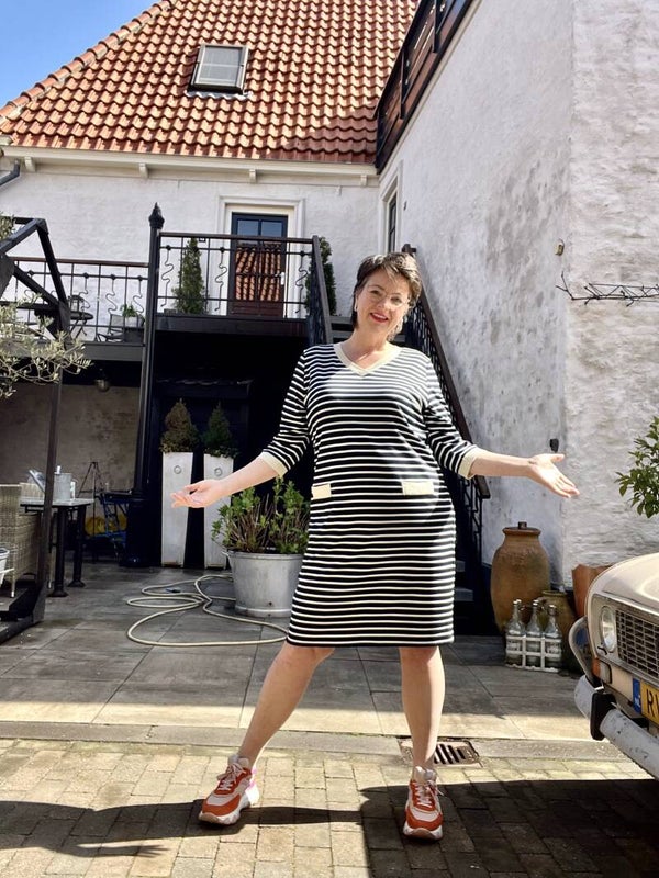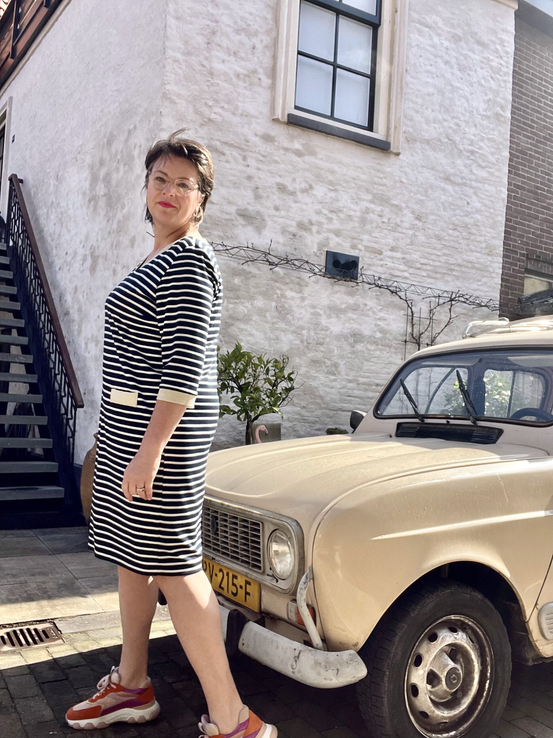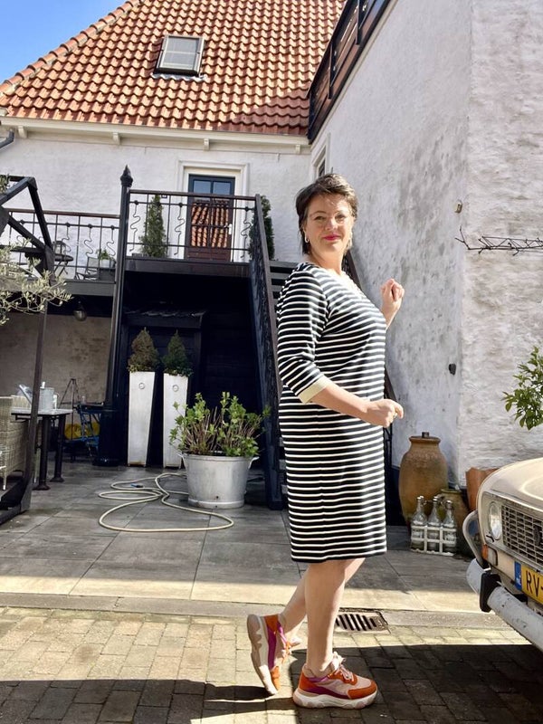 Leuke, sportieve jurk, afgewerkt met goudkleurige details.