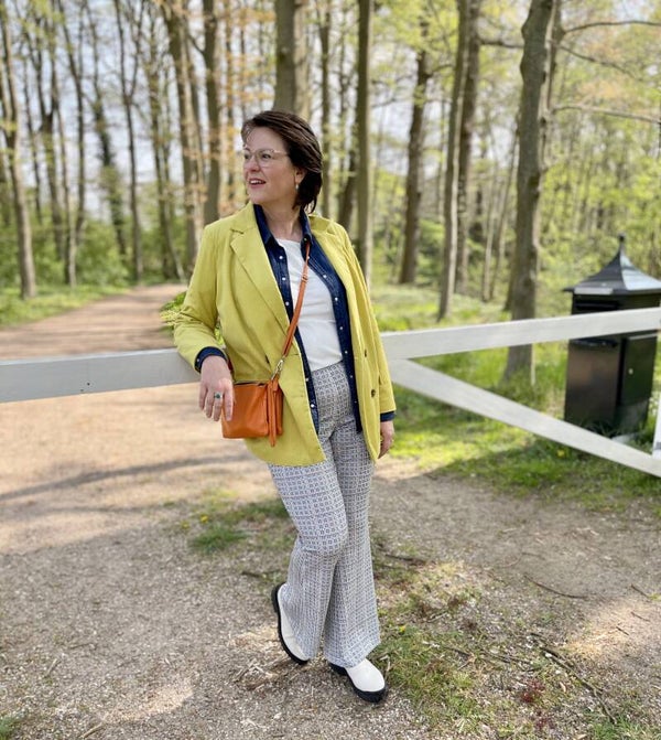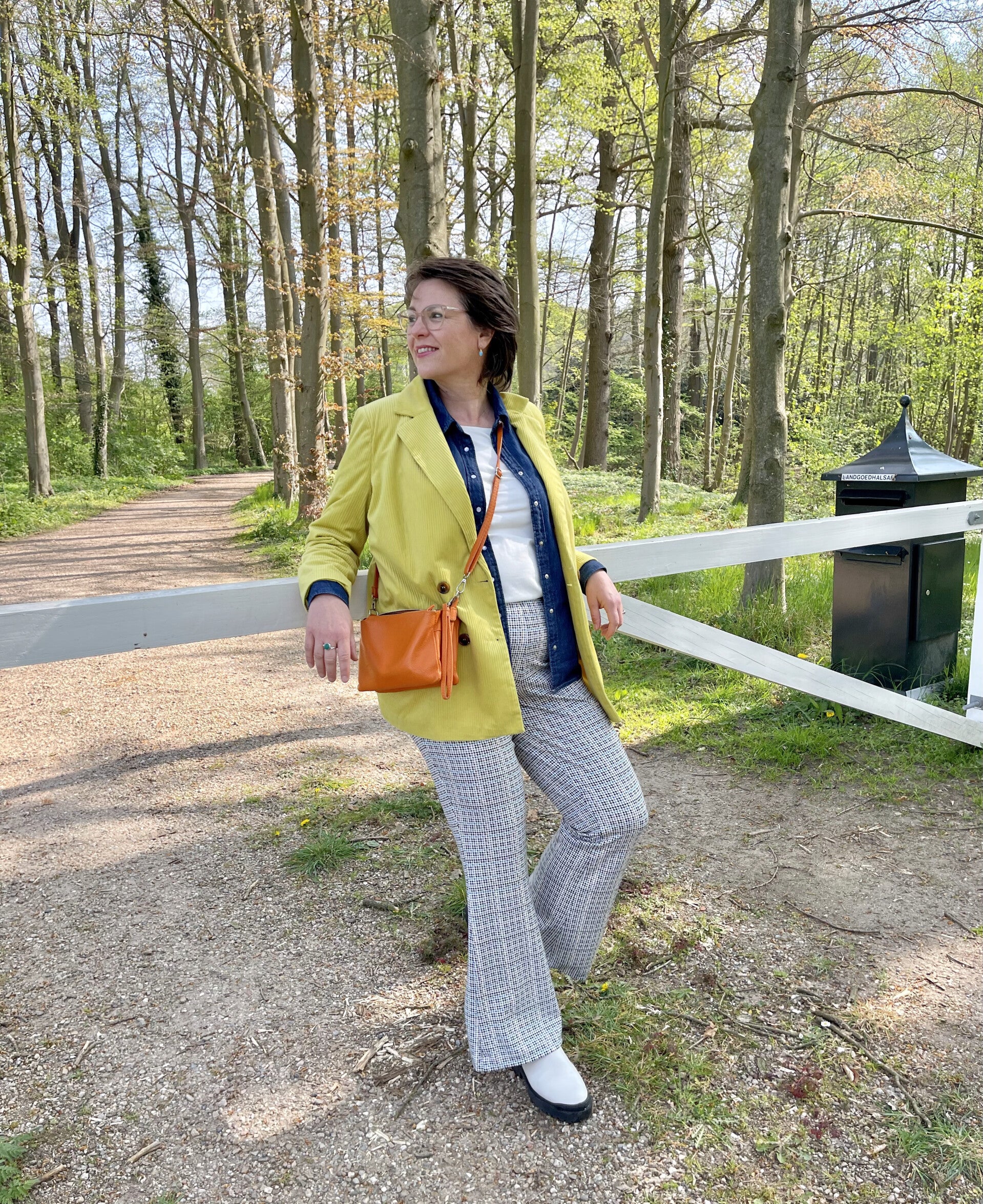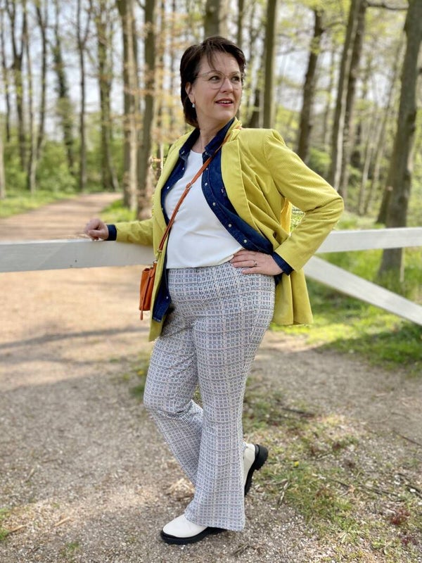 Pantalon met subtiele pied de poule print met verschillende kleuren.