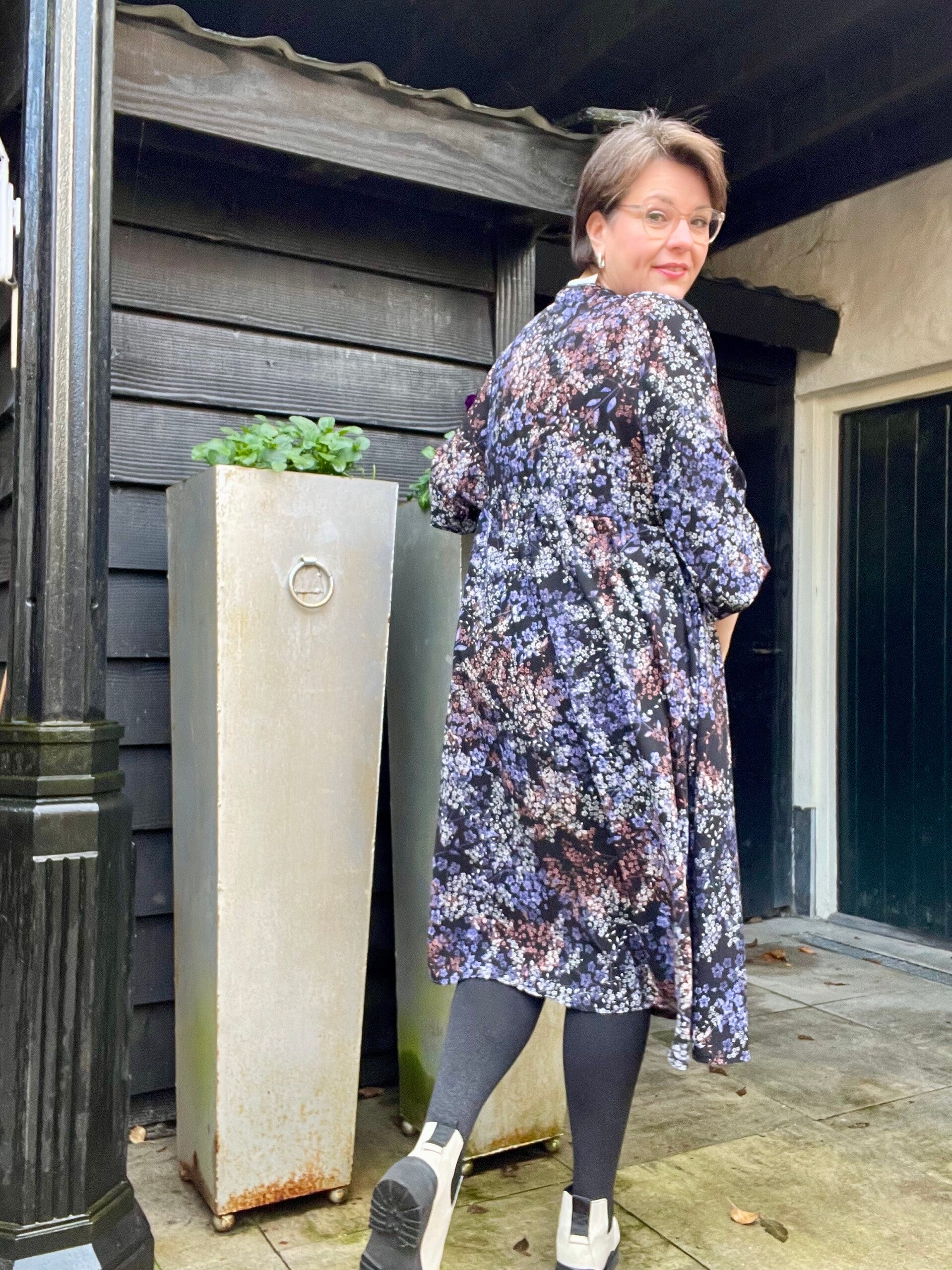 Overslagjurk met elastiek in de taille met prachtige print met oa lilla en bruinoranje op een zwarte ondergrond.