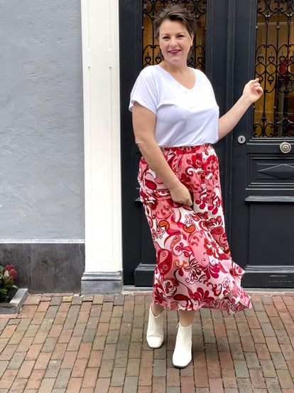 We hebben deze rok in deze langere uitvoering tot onder de kuit en ook in een kortere versie tot op de knie.